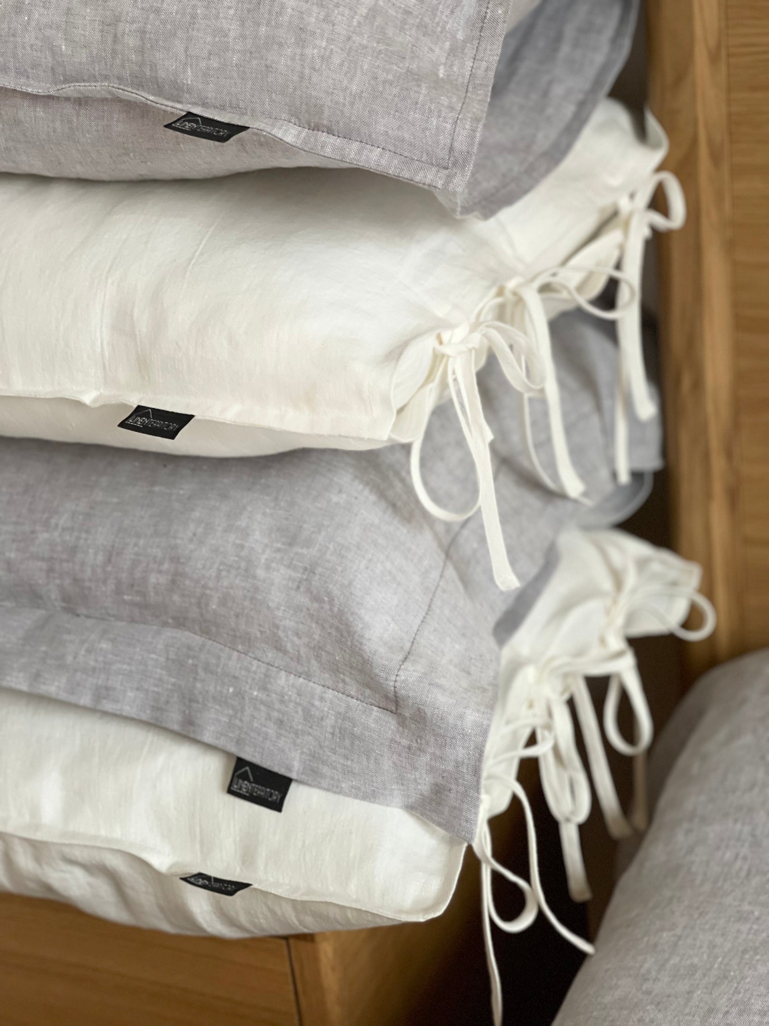 The main decorative element of the SKINNY TIES linen pillowcase are same material tailored 1 cm wide narrow cords at the side of pillowcase that you can tie in a bow and 1 cm flange all around.