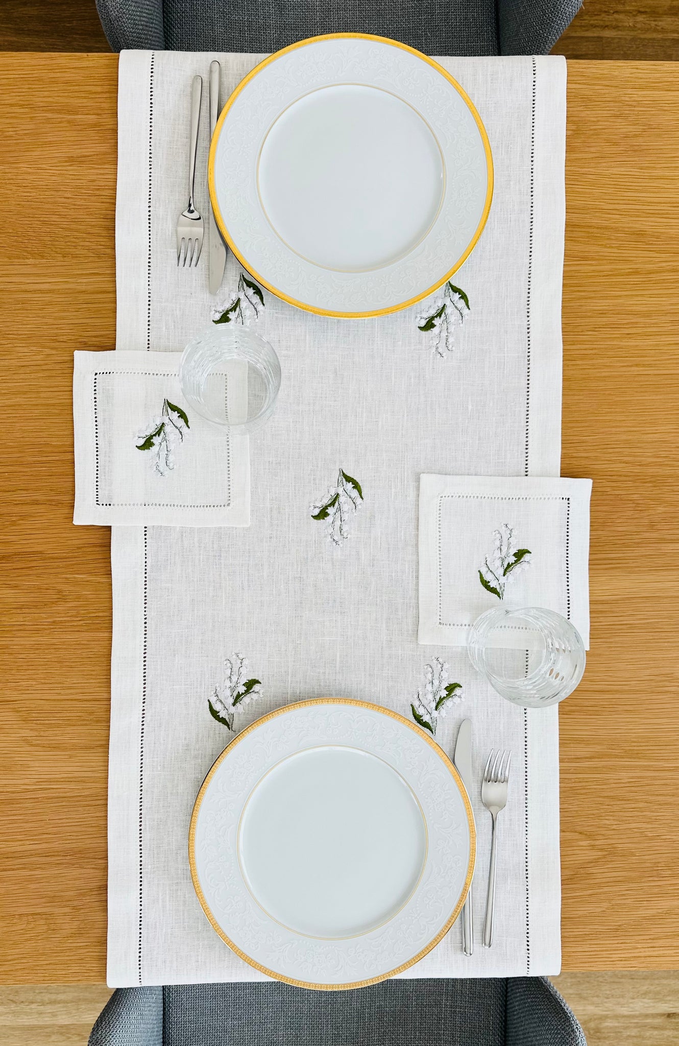 These embroidered linen coasters are a small detail that instantly elevates a table setting. The delicate lily of the valley motif feels timeless—fresh, understated, and naturally elegant—making them ideal for everyday use and special gatherings alike.