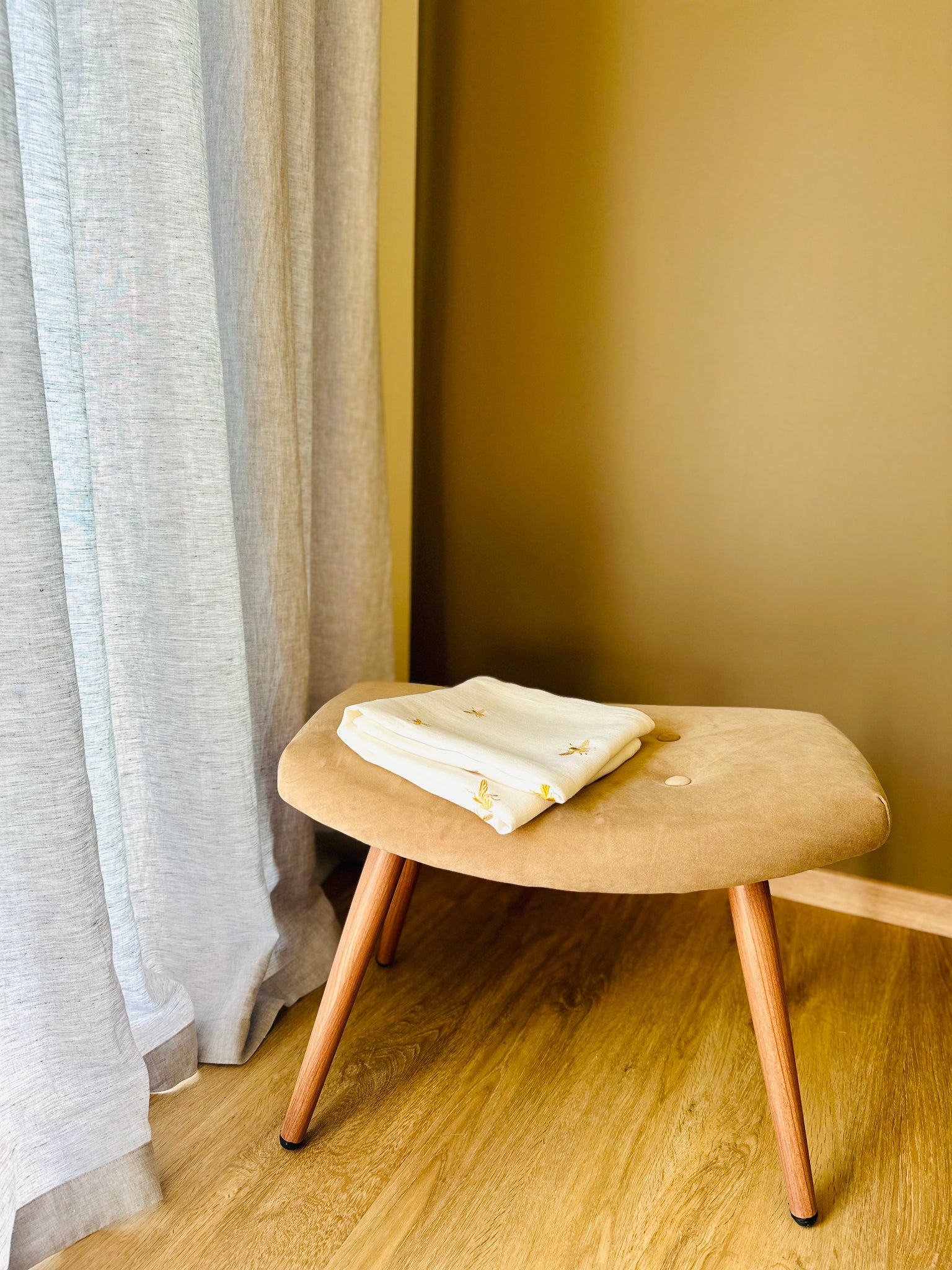 Krāsa: piena balts vai dabīgas krāsas dvielis, zelta, violeta vai rozā nokrāsa bišu izšuvumam.