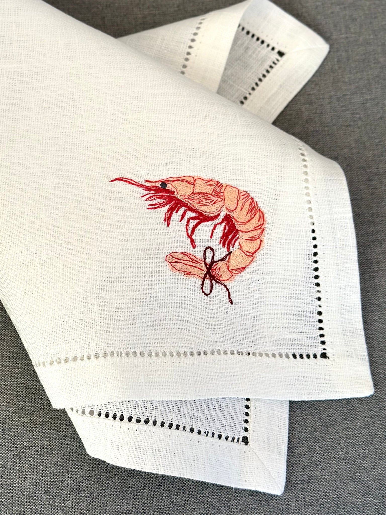Baltas lina salvetes ar krabja, omāra, jūras zvaigznes, garneles gliemežvāka un koraļļa izšuvumu - piestāvēs piekrastes mājām, jūras velšu maltītēm vai kā dāvana kādam, kurš novērtē mūžīgas, ilgtspējīgas galda tekstīlijas.