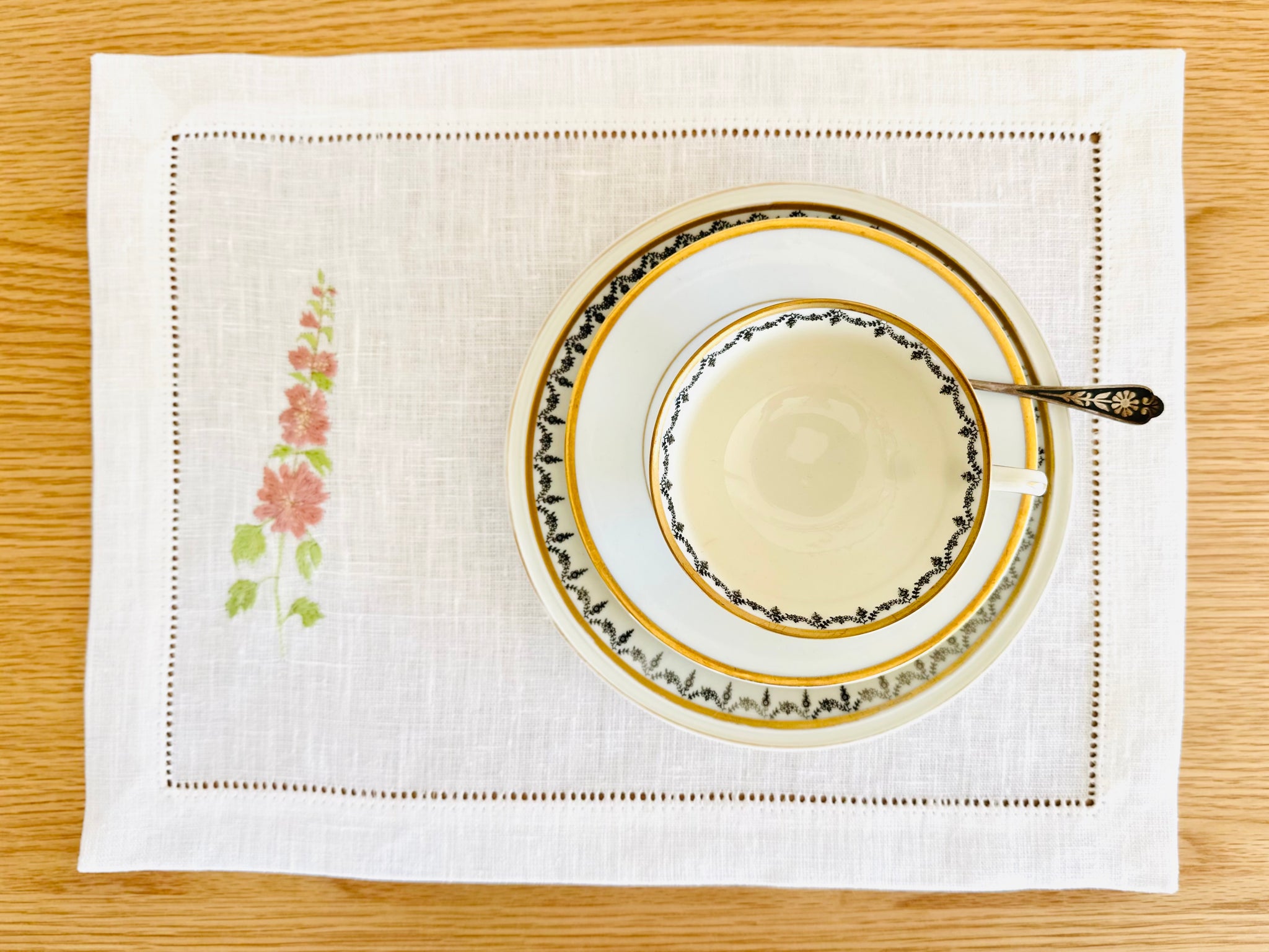 Machine wash gently (cold or 40 °C / 104 °F) on a mild cycle. Avoid bleach and fabric softeners. Wash separately from colored items. Air dry flat or hang in shade—tumble dry on low only if necessary. Iron while slightly damp on the reverse side to preserve embroidery and hemstitched edge. Note: linen may shrink ~5% from the first wash.