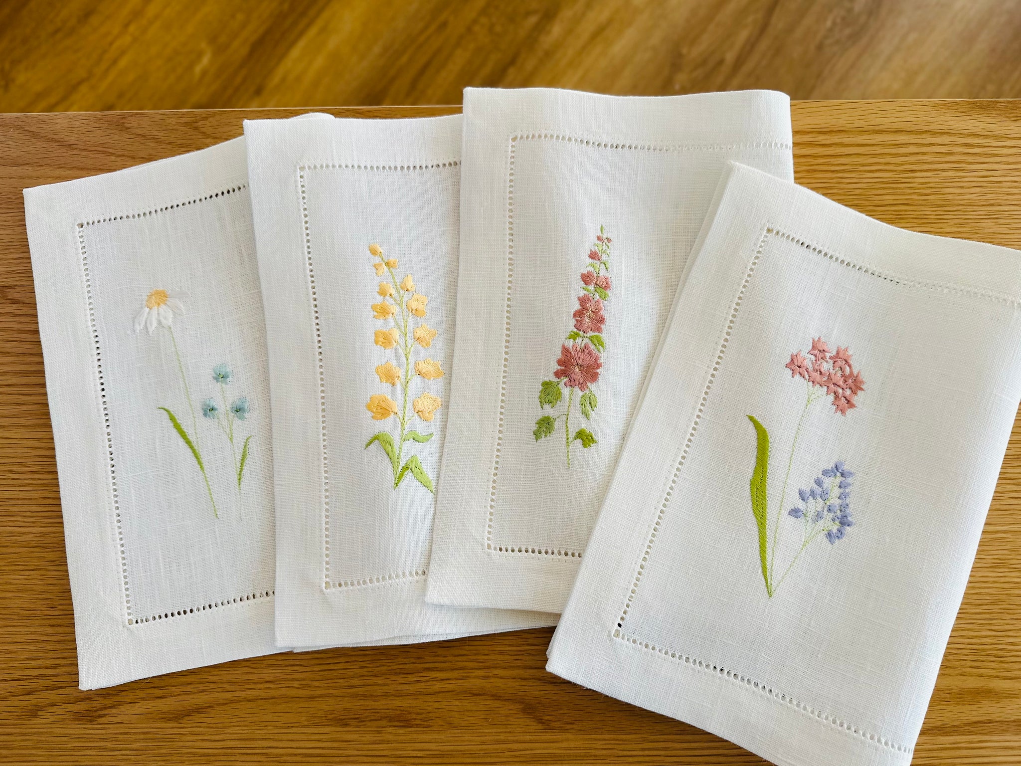 Set of 4 off‑white linen placemats with machine‑embroidered meadow wildflowers motifs and hemstitched edges - perfect eco table linens for botanical dining & hostess gifts.